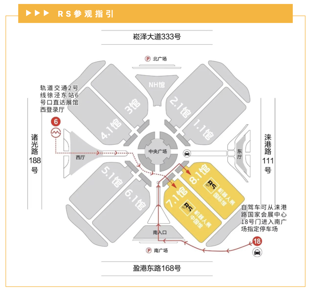 2.如果您自驾车可从国家会展中心18号口(涞港路段),进入南广场指定停车场。从南登陆厅即可到达7.1H&8.1H。